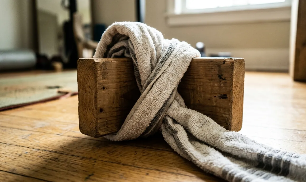 Lai sāktu, paņemiet cieši sarullētu dvieli vai stingru auduma jostu.