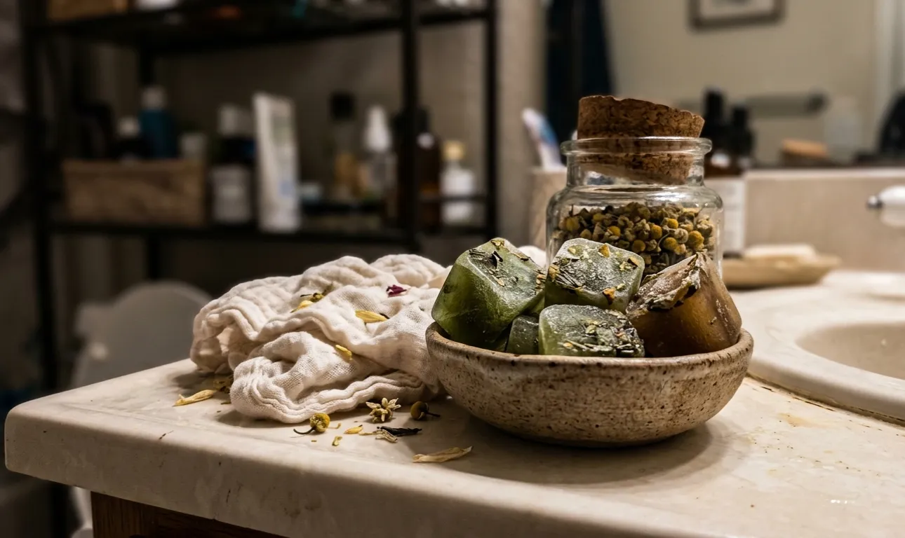 Sejas berzēšana ar ledus gabaliņiem no kumelīšu novārījuma